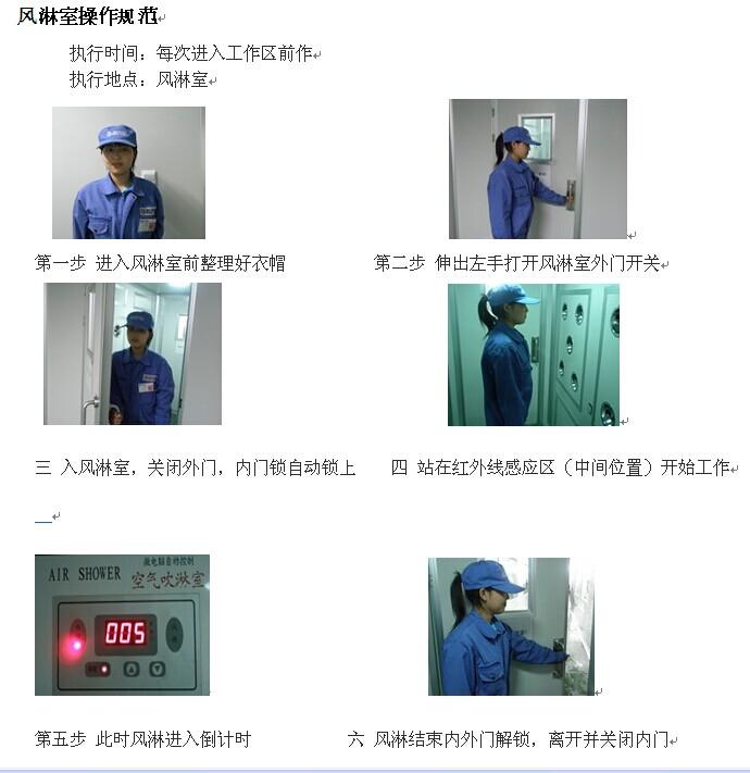 依風淋室作業(yè)標準書進行正確使用,避免違規(guī)操作,如:不能隨意更改風淋室設(shè)定的各項參數(shù);在正常工作模式下,切勿強迫開關(guān)風淋門,不能觸動任何控制開關(guān);風淋前后,輕開輕關(guān)風淋門;發(fā)生故障時,不要慌,最好不要啟動手動按鈕,請及時通知專業(yè)人員來處理。